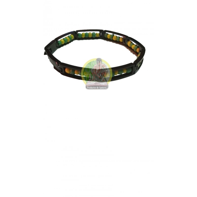 Esta hermosa pulsera de orula realizada en metal con cuentas verdes y amarillas de cristal con un broche de seguridad.