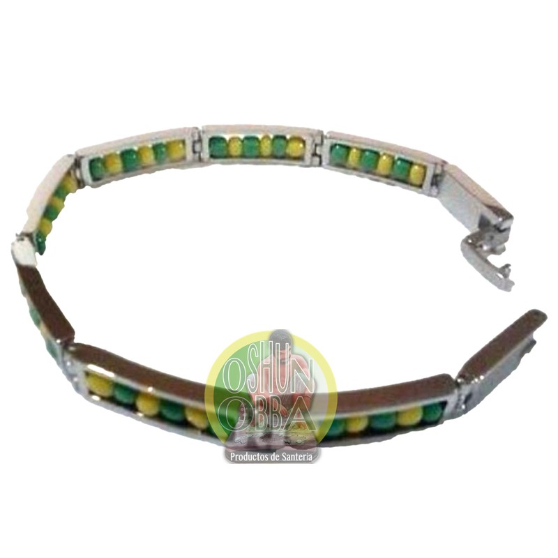 Esta hermosa pulsera de orula realizada en metal con cuentas verdes y amarillas de cristal con un broche de seguridad.