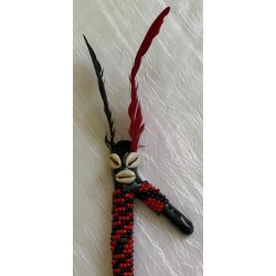 Garabato de Elegguá decorado con cuentas de cristal, caracoles y plumas.