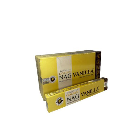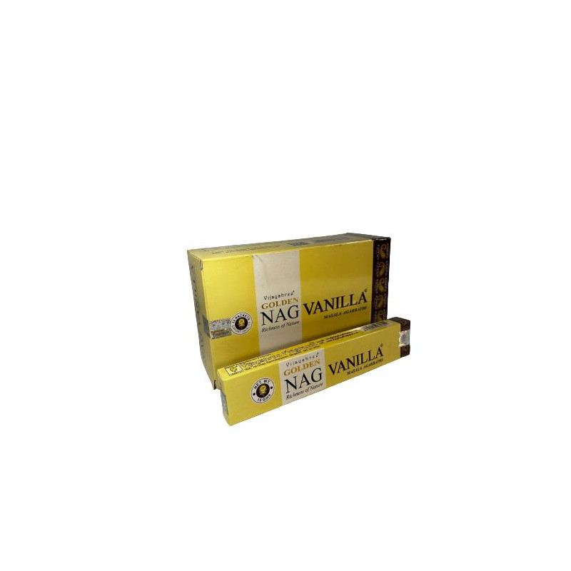 Incienso de la marca GOLDEN, con una increible fragancia NAG VANILLA. Incienso fabricado de manera artesanal provocando una intensa fragancia a vainilla.