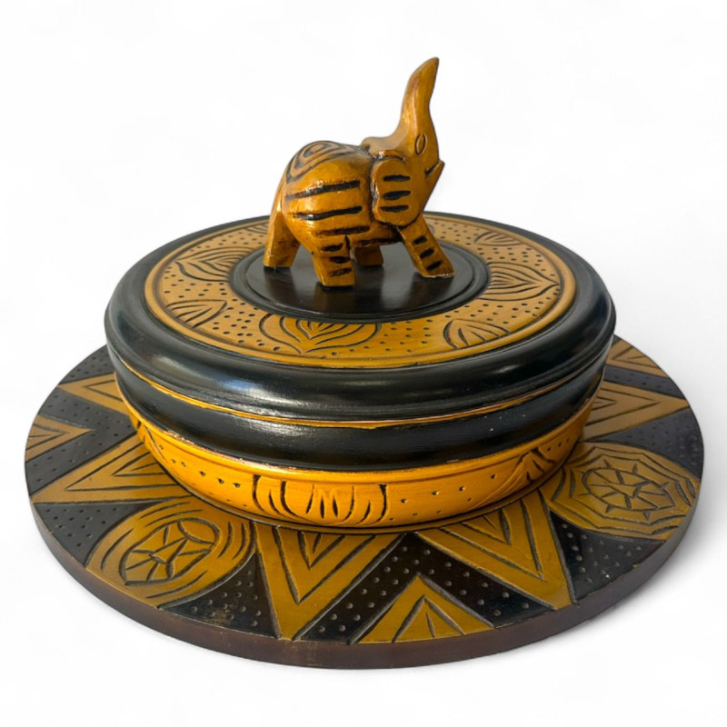 Conjunto de batea y tablero de madera de primera calidad, tallada artesanalmente con figura de elefante.