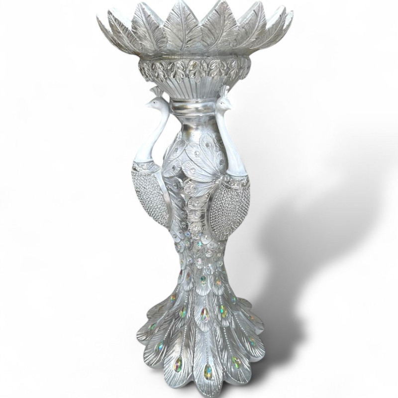 Pedestal para Oshún con figuras pavo real de resina decorado para poner a tus santos en alto.